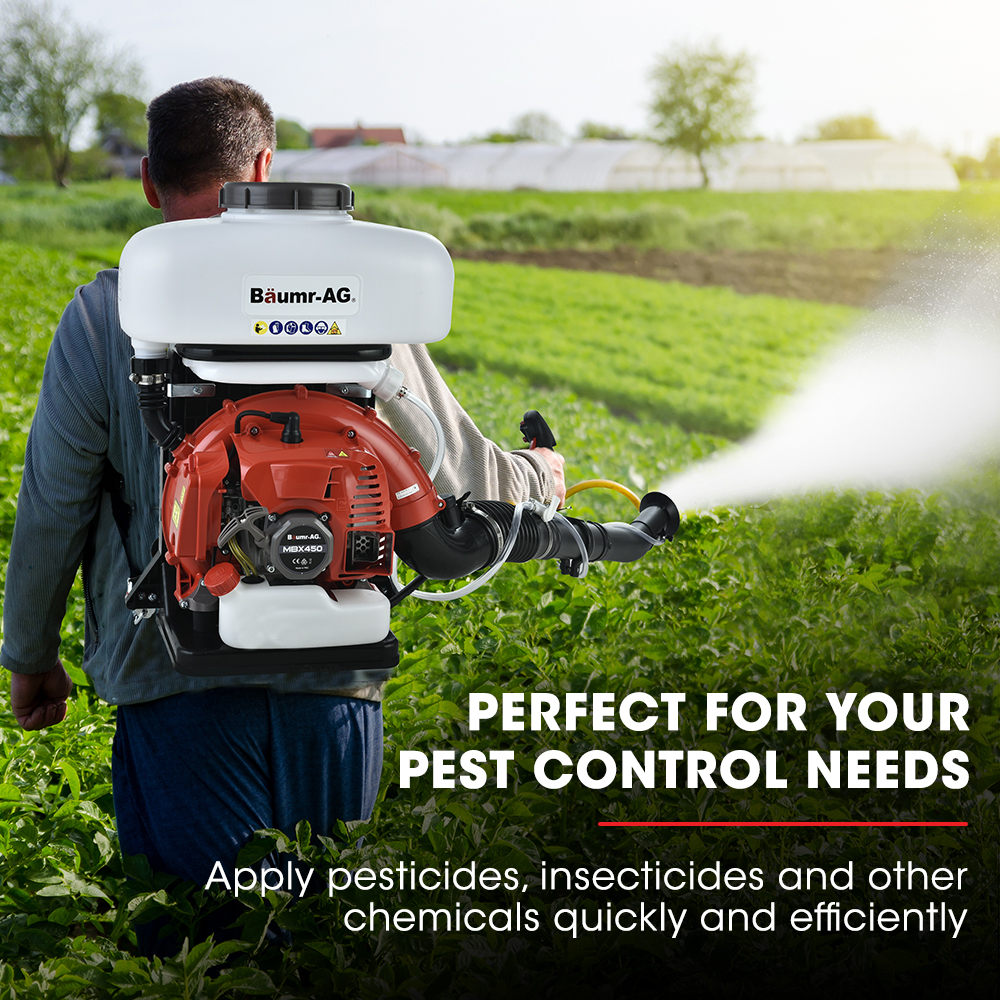 Besides being a must-have for applying pesticides, insecticides and other chemicals quickly and efficiently, the Baumr’s innovative design allows you to disperse grains, disinfect surfaces, spray livestock, and can even function as a powerful leaf blower! It’s without doubt one of the most versatile backpack blowers on the market.