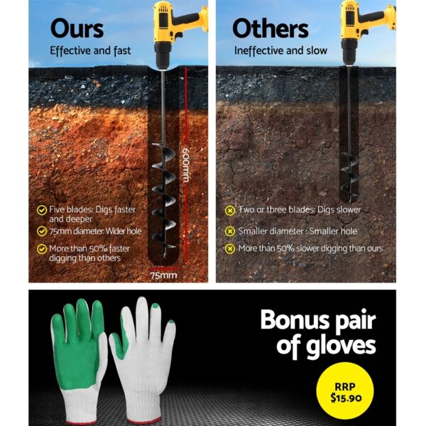 Effortlessly dig up to 60cm deep with the Giantz Power Auger. Made from heavy-duty steel, its compatible with most power drills and ideal for various ground surfaces. Includes gloves and a 1-year warranty.