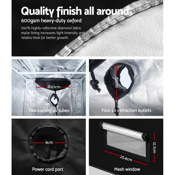 Lightweight and portable with a weather proof 600D Oxford fabric exterior and aluminium foil inner lining, our Grow Tent is equipped with all the necessary essentials to facilitate healthy growth of your plants and vegetables. These include fittings and spaces for various sized fans, lights and filters; two power cords ports; easy accessibility with zipped and velcroed covers; spacious interior and a sturdy, power-coated steel frame for longlasting use in typical Australian climatic conditions. Not least, the entire unit also rests on a removable waterproof floor tray.