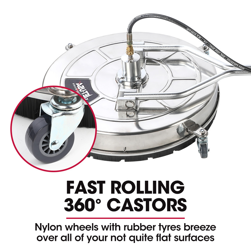 Its constructed from 304 Stainless steel for corrosion resistance and durability. With smooth rolling nylon castors it is the ideal tool for any of your flat surfaces, wooden decks, concrete drives and paths, brick and tiled patios, pool decks, and any other flat durable surface that requires cleaning.