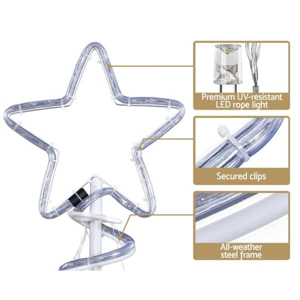 Bring the brilliance of Christmas to your home with our mesmerising Jingle Jollys LED Christmas Tree. A rope light with 36 multi-coloured LED bulbs per metre spirals up the tree-shaped metal frame to the star on top. The LED bulbs flash brilliantly to light up your festive spirit, and you can adjust the speed to suit your preference. The 8m long power cable gives you more flexibility on where you can set up the tree. Place it indoors in your living room, or outdoors in the front yard for all your neighbours appreciate. Create a lively and bright Christmas ambience throughout the season.