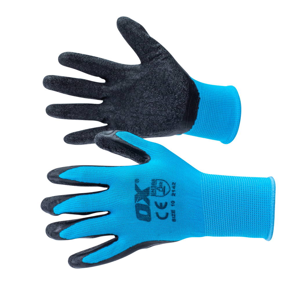 The OX Safety Latex Gloves are designed to provide superior hand protection and grip for professionals across various industries. Constructed with high-performance latex, these gloves offer an excellent balance of strength and chemical resistance, safeguarding against snags, punctures, abrasions, and cuts. The 15-gauge polyester lining ensures comfort during prolonged use, while the latex crinkle-coated palm delivers enhanced grip, making them ideal for tasks requiring precision and control. Additionally, the knit wrist design prevents debris from entering the glove, maintaining cleanliness and safety.