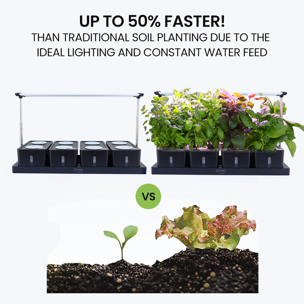 The MY FARM 20 Pod Indoor Hydroponics Growing System is an elegant addition to any home decor, allowing you to grow plants indoors at a 30-50% faster rate than conventional soil planting. With high performing automatic LED lights, you can conveniently produce freshly grown veggies, fruits and herbs in no time.