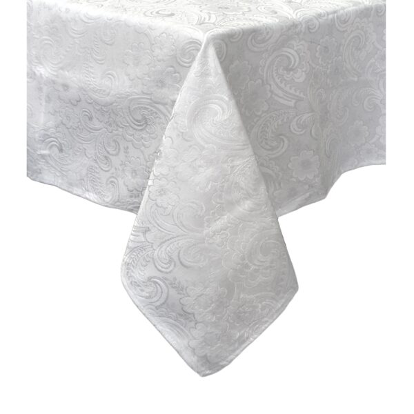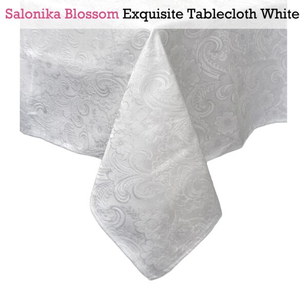 The Salonika Blossom Exquisite Tablecloth White is a perfect option to add personality and style to your table. This clean and crisp tablecloth features a floral jacquard design in classic white colour tone that makes your table look elegant. It is made from quality and easy care Polyester Cotton blend fabric.